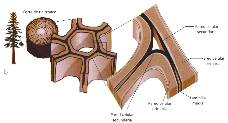 Las paredes celulares poseen múltiples capas. Entre las paredes de células adyacentes existe una capa de polisacáridos adhesivos (en café oscuro) que mantiene a las células unidas entre sí.