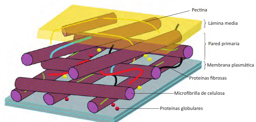 La laminilla media, como parte de la pared celular, mantiene unidas a dos células contiguas. En seguida, cada célula vegetal construye su pared celular primaria a cada lado de esta laminilla. La pared primaria contiene, principalmente, moléculas de celulosa asociadas en haces de microfibrillas entretejidas de manera que forman una red que protege a la célula y proporciona soporte a la planta. Las microfibrillas están dispuestas en una matriz de polímeros viscosos. La celulosa de las paredes celulares es precisamente la que proporciona el volumen de fibra en nuestra dieta alimenticia. La pared primaria está presente en todas las células vegetales y es producto de la acumulación de 3 o 4 capas sucesivas de microfibrillas de celulosa.