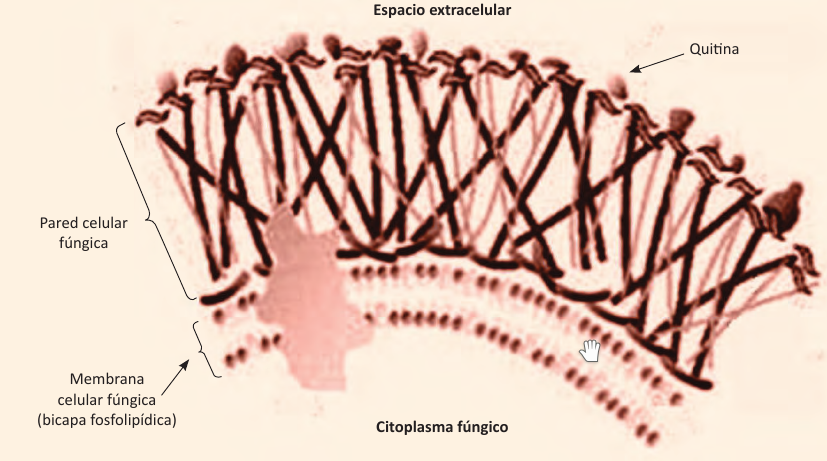 La mayoría de los hongos poseen pared celular, cuyo principal componente es el polisacárido nitrogenado llamado quitina, misma que le da dureza a los exoesqueletos de los