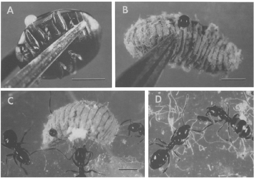 Larvas de dos insectos, un escarabajo coccinélido (Hyperaspis trifurcata) y una mosca chamaemióide (Leucopis sp.), alimentarse de insectos cochinilla y apropiarse del ácido defensivo de su presa, el ácido carmínico, con fines protectores el suyo H. trifurcata descarga la sustancia química con gotitas de sangre (hemolinfa) que emite cuando se la molesta; Leucopis sp. eyecta el compuesto con fluido rectal. Las hormigas se ven frustradas por estas defensas, que se comparan con la defensa descrita anteriormente de una oruga piramidal (Laetilia coccidivora) que libera ácido carmínico cargado de fluido de cultivo El fluido defensivo de las tres larvas contiene ácido carmínico en concentraciones que abarcan un rango disuasivo comprobado para las hormigas. Se sabe que muchos insectos se apropian de sustancias defensivas de las plantas. Los insectos que adquieren productos químicos de defensa de origen animal pueden ser relativamente raros.