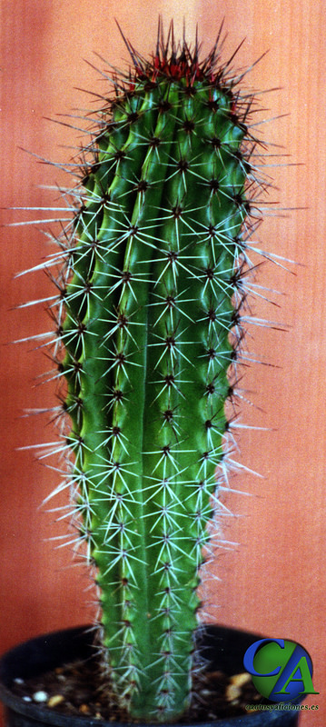 – Descripción: En la naturaleza posee tallo columnar, que alcanza los 7 m. de altura, aunque sin un tronco bien definido, pues ramifica por encima de la base, emitiendo entre 5 a 20 ramificaciones de 15 – 20 cm de diámetro, ascendentes y curvadas hacia arriba, y ramificadas a su vez. Cada articulo posee 12 – 17 costillas, mas bien bajas, mas agudas en la parte juvenil y mas redondeadas en la adulta.